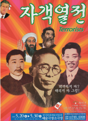 조선은 명나라에 꼼짝을 못했다. 심지어는 명나라가 망하자 그를 이어받은 나라라 하여 소중화(小中華)를 자처했고, 200년이 넘도록 청나라 모르게 신종황제(임진왜란 때 조선 파병을 결정한 명의 황제)를 제사지냈다. 맥아더 동상을 철거하자니까 친미보수주의자들이 길길이 반대했다. 의리를 지키자면 명나라의 이여송 장군, 당나라의 소정방 장군의 동상도 세워야 한다. 한갓 연극쟁이 주제에 왜 이런 정치적인 언사를, 그것도 순진하게 내놓느냐고? 내 얘기가 현실적이지 못하다는 것은 나도 안다. 그렇지만 연극이, 예술이 현실을 얘기하는가? 종교인들이 모여 북한 정권 타도와 조지부시 만세를 외친다. 종교적 신념일 것이다. 철학자들이 모여 전시작전통제권 환수 반대를 선언한다. 현실에 대한 철학적 고뇌가 컸을 것이다. 예술가가 현실을 말하면 철학자보다 덜 역겨울까? 예술가는 진실을 얘기해야 한다. 객관적 진실로서 얘기할 때 백범 김구 선생은 테러리스트이다. 일본에게는 당연히 그러했고, 우리 민족에게 동정심이 없었던 나라 사람들에게 그는 테러리스트였다. 심지어 해방후 미군정 책임자였던 하지 중장도 그를 테러리스트의 두목으로 치부했다. 그래서 우리는 마음이 불편해진다. 우리 민족의 스승, 큰 어른이신 백범 선생께서 테러리스트라니. 애국주의라는 현실적 정서에서 보니 백범이 테러리스트라는 진실이 불편하고, 세계 최강 미국이라는 존재를 어찌할 수 없는 현실에서 보자니 이라크 전쟁도 북 핵도 다 미국이 문제의 본원이라는 진실이 불편해진다. 그래서 테러리스트와 테러의 본질에 대해서 궁구해보게 된 것이다. 테러 그 자체보다 테러의 이유에 대해서 생각해보니 거기에 어떤 보편적 사실이 찾아지게 된다. 테러의 이유(의리, 충절, 약속, 종교적 신념, 극심한 경제적 격차, 강성한 힘의 압박, 인종주의적 압살 등등)가 전 지구적으로 공통되게 나타나고, 역사적으로 반복된다는 것이다. 전 지구적으로 그러하고 먼 옛날부터 지금까지(아니, 어쩌면 미래까지)그러하다는 것, 이것이<자객열전Terrorists>주제의 공시성(Diachrony)과 통시성(Synchrony)이 극적 구조로서 구체화된 연유이고, 이 연극이 열전(列傳, series) 형식을 갖게 된 이유이다. 이 극을 보고, 또 이 글을 읽고 마음이 불편한 분이 있다면 내 언사의 논리에 문제가 있어서일 것이라고 믿고 싶다. 연극을 만드는 내 기술에 문제가 있어서일 것이다. 연극과 예술이 진리를 말해야 한다는 명제에 누가 부정할 것인가. 때로는 망각이, 때로는 강고한 현실이 문제일 것이다.