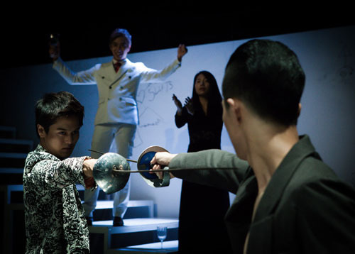 햄릿의 주위에 모든 인물이 에워싸며 야유와 조소 그의 나약하고 우유부단한