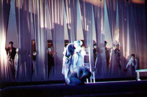 유령(선왕)의 품에 왕비가 안겨있다. 왕비는 거짓 사랑의 고백을 하며 선왕을