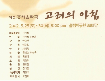 월드컵 문화축전의 일환으로 서울예술단이 공연한 가무극 <고려의 아침> (2002년 5월25일~30일)이 그것이다. 팔만대장경을 소재로 평화를 희구하는 고려인들의 영원을 춤과 노래로 형상화한 이 작품은 여러 면에서 관객들의 시선을 사로잡기에 충분했다. 이 작품은 크게 세 가지 점에서 의미 있는 공연이었다.