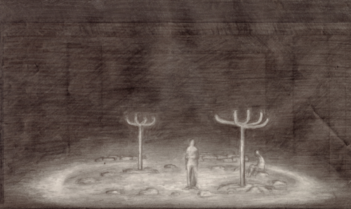 두 그루의 마른 나무는 인간계의 상대적 관계를 상징한다.