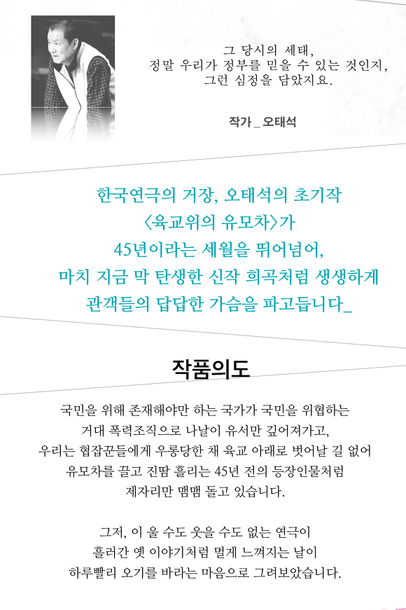 "맞벌이부부, 교통난, 유아 우유, 유모차, 악덕업자, 공해, 수시로 변하는 뉴스 등 우리 소시민이 겪고 있는 문제들을 다루고 있는 이번 '육교 위의 유모차'에서도 나는 구김살 없는 한 시민의 표정만을 보이고자 하지는 않는다. 오히려 상황이 다른 두 개의 모노드라마를 똑같은 판소리. 꼭두각시 사설, 탈춤 둥 고유민속의 리듬에 관심을 갖고 이들의 현대적 의미를 더욱 적극적으로 대입해 봄으로써 정립되어 있지 않은 우리나라의 무대 문법을 이룩하는데 이바지해 보고자 한다.