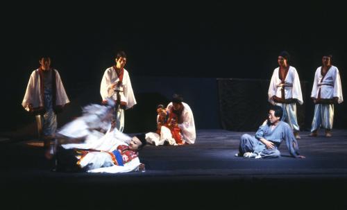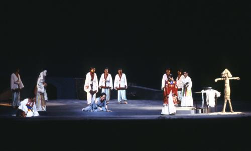 작가는 삼국유사의 신화적 소재에다 굿이라는 제의적 형식을 접목시킴으로써 우리 민족의 원형적인 심성을 부각시키려 한다. 그 원형적인 심성은 구체적으로 ‘신과 인간의 사랑’ 이라는 설정에서 발견할 수 있다 작품은, 바다의 신과 인간이 서로 만나 사랑을 나누고 그 사랑의 힘으로 역신마저 포용한다는 설정에 기초해있다. 이는 곧 성과 속, 외부와 내부, 자아와 타자의 것이 혼융되고 습합되는 용광로와도 같은 상생의 민족성을 드러낸 것으로 읽힐 만하다 “우리 반도가 가지고 있는 조건이 뭐냐 삼면이 바다라는 거 아닙니까, 동해 용왕의 자식이 인간을 사랑하고 바다와 인간이 만나고"라는 작가의 술회 또한 이러한 해석을 간접적으로 뒷받침해준다. 중요한 것은, 신과 인간의 사랑을 표현하는 작가의 상상력이다. 이와 관련해 ‘왕생극락’과 ‘금왕산다리’의 마지막 두 장면이 특별히 주목된다. 작가는 용칠과 낭자의 사랑을 보다 극적으로 표현하기 위해 용칠을 죽게 한 뒤 낭자로 하여금 넋굿을 통해 명부를 여행하게 한다. 그 결과 낭자는 용칠의 환생을 약속받게 되지만, 정작 그녀가 얻은 것은 용칠의 육신이 아니라 신주일 뿐이다. 요컨대 이 사랑이야기는 연인의 죽음 → 명부 여행 → 연인과의 재회와 이별의 도식으로 요약될 수 있다. 이러한 이야기의 구도는 우리에게 매우 낯익은 것으로, 고대 그리스의 ‘오르페우스 신화’를 연상시킨다. 신화에서 아폴로의 아들인 오르페우스는 불의의 사고로 아내 에우리디케를 잃게 된다. 그는 아내를 찾아 저승인 하데스를 여행하게 되고, 아름디운 리라 연주로 지하의 여왕을 감복시켜 아내를 되찾게 된다. 그러나 하데스의 입구에서 지하의 계율을 어긴 탓에 그는 아내를 영원히 잃고 만다. 서구 예술의 단골 소재로 자리 잡은 이 오르페우스 신화는 여러 면에서 〈팔곡병풍〉의 성격과 겹친다. 첫째, 연인의 죽음 → 명부 여행 연인과의 재회와 이별이라는 이야기 구도가 동일하다. 둘째, 신의 아들이 인간을 사랑하여 아내로 맞는다는 설정 또한 유사하다. 셋째, 비극적인 종말을 초래한 원인이 금기의 위반이라는 점도 같다. 응시의 금기를 어긴 탓에 오르페우스는 아내를 영원히 앓게 되고, 역병의 금기를 어긴 (호귀마마에 대한 연민) 탓에 낭자는 용칠의 신주만을 얻게 된다. 이러한 점을 종합할 때 우리는 〈팔곡병풍〉을 지배하는 작가의 상상력이 근본적으로 오르페우스 신화에 의존한 것임을 알 수 있다. 물론, 오태석 작품에 나타난 ‘명부 여행’ 화소의 기원을 ‘오르페우스 신화’가 아니라 ‘바리데기 설화’에서 찾을 수도 있다. 우리 서사무가의 원본설화인 바리데기 설화에서도 명부 여행의 화소가 발견되기 때문이다 하지만, 엄밀히 말해 바리데기의 저승 여행은 효심의 발로이지 연정의 발로가 아니다 또한 그것은 시련극복의 과정을 보여주기 위한 설정이지 사랑하는 망자와의 재결합을 위한 설정이 아니다. 이러한 이유로 오태석 연극의 명부 여행 화소를 ‘바리데기 설화’의 샤먼 전통과 연관 짓는 해석은 설득력이 떨어진다. 그보다는, 신과 인간의 사랑을 극화하는 작가의 상상력에 오르페우스의 신화가 영감을 제공했다고 보는 편이 옳을 것이다