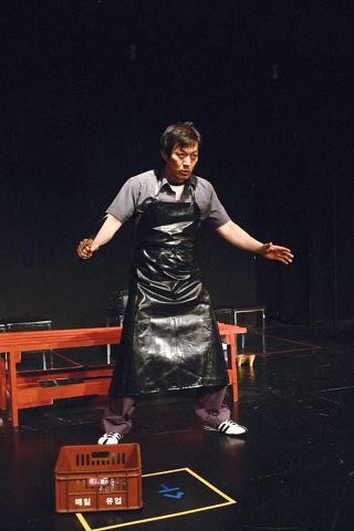 극단 배우세상이 공연하는<칼맨>(김태수 작, 윤우영 연출, 인간소극장, 4.5-7.1)은 이름부터 심상찮다. 칼맨이라니, 혹시 비제의 카르맨의 패로디인가. 그러나 내용을 보면 그저 '칼질하는 남자'일 뿐. 작가는 칼과 남자를 비정상적인 한국어 조어법으로 결합시킨다. 순수국어와 외국어의 결합, 이 부자연스러움을 극복하기 위해선 남자들이 자연스럽게 칼을 휘두르게 만들어야 한다. 이 작품에는 중요한 세 남자가 등장한다. 여동생의 원수를 갚으려고 깡패 두목을 찾아 복수를 꾀하는 마병태, 친구에게 사기당하고 그 친구를 응징하기 위하여 칼을 품고 다니는 공춘삼, 그리고 칼질에는 도통했으나 이미 세속적 칼쓰기는 초월한 식육점 주인 우두철이 그들이다. 겉으로 보기엔 이들이 칼을 잡는 이유가 다 다르지만, 칼이란 무엇인가를 베고 자르기 위한 도구일 뿐이고 칼을 휘두른다는 것은 누군가를 해치기 위함인 것, 결국 이들의 이야기는 현대판 무협지에 지나지 않는다. 그러나 무협지도 잘만 쓰여지면 품위가 생기는 법, 보여주기에 따라서는 시공을 초월한 보편적 감수성도 획득할 수 있는 법이 아니던가. 작가는 자칫 하찮은 칼부림 정도로 끝날 수도 있는 이야기를 끌고 가면서 나름대로 상처받은 인생의 아픔을 어루만지고 쓰다듬을 줄 안다. 칼날의 번득임만큼이나 재치와 유머도 돋보인다.