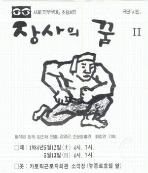 황석영의 단편소설인 '장사의 꿈'은 81년, 84년 두차례에 걸쳐 임진택 연출에 김명곤과 임명구의 출연으로 무대에 올려져서 숱한 화제를 불러 일으키며 관객들의 열렬한 사랑을 받았던 작품이다. 이 작품을 새로이 올리면서 원작의 배경인 1960년대를 80년대 후반으로 끌어올리는 창작과정 속에서 초연정하고, 6.29선언 직후의 사회 상황을 반영하면서 몇 개 역할의 성격을 바꾸기도 하여 새롭고 시의성 있는 작품으로 만들었다. 30년 전 빼빼 마른 젊은 시절의 광대 김명곤이 신촌 굴레방 다리 밑 애오개 극장에서 보여준 명연기는 아직도 많은 이들에게 회자되고 있다.