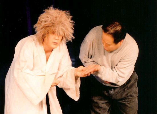 시장바닥의 구연술을 갖고 있는 친근감과 스타일이 갖는 공연장 안에서의 현장감과 즉흥성 같은 것이 서로 잘 어울린다는 사실은 확실하다. 그런 탓으로 마당극 양식이 쉽사리 약장수 스타일로 저질스러워질 때 그 한계를 지키게 하는 것으로 우리는 작가정신이나 예술가정신을 든다. 이야기의 재미에 끌려든 관객과 그 분위기에 흥겨워진 연기자들이 그대로 어울려지면 마당극의 서사적 구성이 갖는 ‘거리’의 비판정신이 사라질 것이다. 그런 점에서 연우무대의 팀들은 적절한 장면 교환으로 몰입을 차단한다. 그 장면들의 복합에 있어서 김명곤의 변신술은 놀라운 경지를 보여주는데 10여 가지의 인물이나 기능으로 바뀌는 능력은 말하자면 ‘파우스트’의 성취를 돕는 ‘메피스토’ 같은 다양한 변신기능과 상통하는 것이다. 파우스트를 파우스트답게 만드는 것은 메피스토의 협연이다. 그렇게 되면 그가 주연인지 파우스트가 주연인지 그 구별은 명백하지 않다. 파우스트 종속설이 나오는 것도 당연하다. 그만큼 김명곤에 밀려서 장사인 임명구가 그의 성격을 드러내기가 어렵다. ‘장사’의 성격이 뚜렷치 않다는 것은 이야기의 설화성에도 원인이 있다. 뿐만 아니라 민중의 소망을 체현하는 장사가 아니라 개인의 안일과 영달만을 꿈꾸다 떨어져 나간 이 현대적 영웅의 모습은 무성격의 낙인으로 보복 받게 되어 있다. 그만큼 성격이 선명할 수가 없는 것이다. 임명구는 재질이 있고 부드럽다. ‘장사’가 되기 위해서 그는 발성법의 훈련 그리고 체능의 절도 있는 수련이 얼마나 필요한가를 알아야 할 것이다.