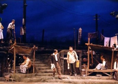 1947년 문교부 주최 제1회 전국연극경연대회 작품상 수상. 8·15광복 후의 민족의 감격과는 대조적으로 나날의 생계를 위협받고 있는 하층민의 생활을 묘사하는 가운데, 작자는 "40년 동안을 그렇게 슬프게, 비굴하게 살아오구두 그래도 아직도 모자라서 우리는 나 하나만을 찾구 나 하나만을 내세워야겠고?" 하며 과거의 역사를 반성, 힘을 합쳐 내 집을 일으키고 나라를 세워야 할 정신을 일깨워주려는 작품이다. 일제시대의 방공호(防空壕)에 살고 있는 땜장이 목판장수, 복덕방 거간을 중심으로 댄서, 암거래상, 노동자 등 28명의 등장인물이 나오는데, 그 중 분명한 의식을 지니고 있는 자는 일본에서 공부를 한 원칠뿐이다. 그는 기대가 컸지만 광복 후의 혼란 속에서 무력한 생활을 하고 있어, 폐결핵으로 신음하고 있는 아내 때문에 더욱 고통스러운 목판장수 형과 늘 충돌을 일으킨다. 땜장이는 본처의 딸을 술집으로 보내자는 술장수 후처의 졸림을 당하나, 딸이 복덕방 거간의 아들과 도망쳐 공장에 취직하자 숨을 돌린다. 홀아비 복덕방 거간은 새장가를 드는데 그 계집에게 생명처럼 아끼던 돈을 도둑맞고 자살을 한다고 야단이다. 원칠은 무력한 생활을 청산, 돈을 벌기 위해 공사장(工事場)에 나가 일을 하다가 부상을 당해 오면서 형수가 먹고 싶다던 것을 사왔으나 이미 형수는 죽어 있었다. 형수의 장례를 치르는 가운데 멀리서 지경다지는 소리가 점차 높아져 온다. 광복 후의 사회상의 단면(斷面)을 매우 리얼하게 보여 주는 작품이다.