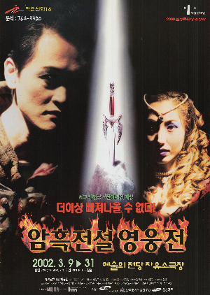 컴퓨터게임을 소재로 한 사이버 세계를 거론한 최초의 연극 작품이다. 가상의 세계와 현실의 세계가 교차해 무언가 강력한 이미지를 전달한 '암흑전설 영웅전(연출 최용훈)'이 그 작품이다. '암흑전설 영웅전'은 컴퓨터게임을 소재로 한 사이버 세계를 거론했다는데 점에서 그 의미를 찾는다. 현실 속에서는 방구석에 틀어박혀 컴퓨터게임에 매몰돼 사이버 중독으로 인한 현실도피, 그 속에서 사이버 게임을 통한 영웅이 탄생한다. 이것은 사이버 대리 만족의 극치를 이룬다. 바로 그 주인공이 현실 세계의 작가 지망생이다. 그는 결국 현실 세계에서 개발한 컴퓨터를 통해 사이버 세계의 게임을 즐긴다. 그리고 가상세계의 암흑의 황제가 된다. 디지털시대 1과 0으로 대변되는 가상세계의 무희는 현실 세계의 창을 동경하고 그리워한다. 그는 가상세계보다 현실 세계가 나을 것이라고 갈망한다. 현실 세계의 작가 지망생인 주인공 컴퓨터 게임머는 컴퓨터 가상세계의 무희를 좋아하게 된다. 사이버 게임에서 전개되는 청와 장군의 악랄함, 백와 장군의 강렬한 이미지가 두 장군의 이미지를 대조적으로 돋보이게 한다. 군사들의 업그레이드 장면, 국운의 업그레이드 장면이 관객들에게 독특한 이미지를 선사한다. 게임 점수가 올라갈수록 연극의 종막이 올 것 같은 긴장감 속에 연극의 흥미는 더해간다. 게임이란 가상의 세계는 매력적이면서 암담한 미래를 점치게 한다. 컴퓨터 중독이라는 것이 인간에게 얼마나 큰 유혹을 주는가에 대해서도 생각하게 된다. 게임은 현실 세계의 통제와 억압으로 억눌린 욕구를 마음껏 표출할 수 있는 해방구라는 측면도 있지만 가상세계에 도취된 현실의 인간은 윤리라는 것, 도덕이라는 것을 잃어버리게 한다. 가상세계의 살인은 아무것도 아니게 진행된다. 최근 사이버 범죄가 많이 일어나고 있다. 계좌번호를 알아내 현금을 빼낸 것이며, 각종 정보를 해커를 통해 알아내는 신종 범죄 수법들. 이 연극을 통해 사이버 범죄의 제반 문제점에 대해 생각하게 된다. 이렇게 현실 세계와 가상세계는 톱니바퀴처럼 밀접하게 맞물려가고 있다. 현실세계는 가상세계를 창조했고 가상세계는 현실 세계를 재창조해 간다. 현실 세계의 폭력파괴는 가상세계마저 폭력과 파괴가 난무한 것으로 만들고 있는 현실이 이 한편의 연극을 통해 깊이 통찰했다. 최초로 선보인 현실 세계와 가상세계를 풍자한 '암흑전설 영웅전'은 우리 자신들의 현재 모습을 가상현실을 통해 다시 한번 현실을 되돌아보게 만든다.