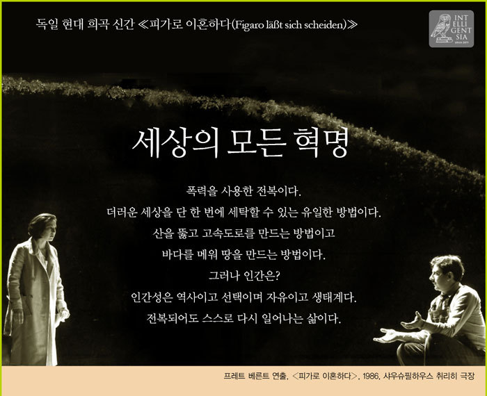 “희극<피가로 이혼하다>는 보마르세의<피가로의 결혼>이후 몇 년 후에 시작된다. 그러나 나는 이 극을 우리 시대에 진행하도록 했다. 혁명과 망명 문제는 첫째, 시간을 초월하는 것이고 둘째로 우리 시대가 특히 당면한 문제이기 때문이다. 그러므로 이 희극에서 일어난 혁명은 1789년 프랑스 대혁명을 의미하는 게 아니라, 모든 혁명을 의미한다. 모든 폭력적 전복은, 우리가 인간성이라고 중시하기도 하고 경시하기도 하는 개념과의 관계에서 공통분모를 갖기 때문이다.<피가로의 결혼>에서는 근접한 혁명의 번개가 멀리서 번쩍이고 있지만,<피가로 이혼하다>에서는 예측이 가능한 번개처럼 번쩍이는 것은 없다. 인간성은 뇌우를 동반하지 않기 때문이다. 그것은 오직 칠흑 같은 어둠 속에 비치는 약한 빛일 뿐이다. 더 세찬폭풍이 그 빛을 꺼버릴 수 없기만을 바란다."