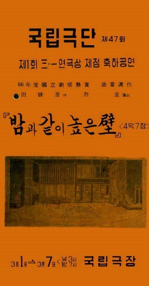 <밤과 같이 높은 벽>은 1966년 국립극단 희곡 현상공모 당선작이다. 아마 이 작품으로 전진호는 혜성과도 같이, 아니면 야생 적토마와 같은 모습으로 연극계에 등장했을 것이다. <들개>로 조선일보 신춘문예에 입선하자마자 같은 해, 1966년 국립극장 장막희곡에 당선되는 기염을 토한 이는 일찍이 없었다. 20대 초반의 나이에 화려하게 등장한 전진호는 천년 가뭄에 비를 기다리는 농부의 심정과도 같았던 당대 연극계에 영원한 해갈을 가져올 역량 있는 작가로 환영받았다. 중견 연출가 허규, 임영웅, 강유정 등 당대 연출가들에게 전진호라는 신예작가는 단지 젊어서만 아니라 당대 삶의 아픈 상처와 기억을 다룰 줄 아는 작가였기 때문에 더더욱 소중하게 받아들여졌다.