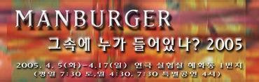 연극 <맨버거, 그 속엔 누가 들어있나?>에는 특별한 주인공이 없다. 모두가 주인공이고, 모두가 중심이다. 무대에 오르는 십여 명의 인물에겐 저마다의 욕망이 있고, 그들의 욕망이 크고 작게 충돌하며 극은 전개된다. 그들에게 지금 이 순간은 인생의 마지막 기회다. 벼랑 끝의 인물들은 더욱 크게 충돌하고 부딪힐 수밖에 없다. 충돌한 그들의 욕망은 마치 폭죽처럼 극의 곳곳에서 터진다. 그러나 그런 갈등과 대립이 신경질적이거나 무겁지 않고, 무척이나 감각적이다.