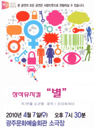 이 작품은 창작뮤지컬이다. 뮤지컬 중에서도 전체가 노래로 구성된, 사람들이 흔히 송 쓰루(song through)라 부르는 뮤지컬이다. 사실 이런 형식의 뮤지컬은 일반적으로 우리가 흔하게 접할 수 있는 뮤지컬 양식과 비교할 때 조금 더 어렵다고 말할 수 있다. 왜냐하면 스토리 전개가 쉽지 않기 때문이다. 대사가 없이 모든 것이 노래로 진행되기 때문에 음악이 훨씬 더 중요해지고 특히 가사와 그 가사를 제대로 전달할 수 있는 멜로디가 더욱 중요해진다. 그러나 이런 형식의 작품들이 세계적으로 유명한 경우도 많다. 가장 대표적인 작품은 프랑스 뮤지컬 <Notre- Dame de Paris>일 것이다. 창작뮤지컬 <별>은 “사람이 죽으면 별이 되고 별이 되어 잘 비추면 사랑하는 사람에게 다시 돌아갈 수 있다”는 전제에서 출발한다. 어느 날 뜻하지 않은 사고로 세상을 떠났고 별이 된 한 가장의 이야기다. 가족들에게 “사랑한다”고 말하지도 못하고 별이 된 그는 최후의 선택을 한다. 스스로 폭발하기로 한다. 자신의 말을 전하려고. 영원한 소멸을 감수하고라도 사랑하는 이에게 사랑한다 말하는 마음, 이것이 정말 위대한 사랑이 아닐까? 이 작품은 사랑과 사랑을 위한 희생의 이야기이다.