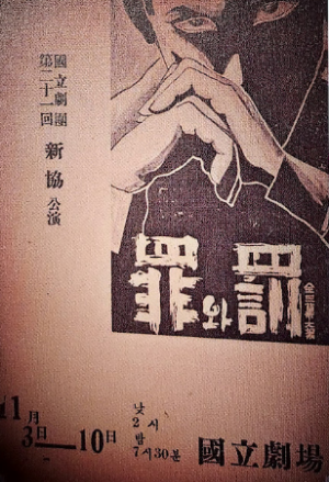 극단 신협의 요청에 의하여 도스토예프스키의 원작소설을 번안 각색하여 한국의 무대로 옮긴 것이다. 1960年 11月3日부터 8日간 중앙국립극단 신협에 의하여 국립극장에서 박동근先生 연출로 초연했다. 원작이 천여 페이지나 되는 大作인만큼 2시간으로 공연할 수 있게 한다는 것은 무척 힘드는 일이었다. 더욱이 우리 것으로 번안하는 일이고 보니 더욱 힘들었다. 심지어 낱말 하나 때문에 고심한 일이 비일비재했다. 그 한 예로 라스콜리니코프가 신봉하는 초인사상에 나오는 "비범인"과 "평범인"같은 말도 밖에서 文字로 볼 때는 무관하지만 연극에서 대사로 들을 때는 이 作品이 "죄와 벌"인 만큼 '凡人'은 '犯人'으로 들리기 쉬울 것 같아서 '凡人'에 平字를 부쳐 '평범인'으로 한 것이다. 원작은 사건의 발단에서 결말까지가 1주 정도로 되어있다. 나는 이것을 긴축감을 내기 위해서 4일간으로 더 단축했다. 또한 原作에서는 시일이 짧은 대신에 사건이 전개되는 곳은 매우 많다. 이 많은 장소를 어느 특정된 한 장소에 집약한다는 것은 무리한 일이었다. 물론 장면을 많이 하면 될지 모른다. 그러나 그런 方法을 한다면 내가 두려워하는 산만함을 면할 수 없을 것이다. 등장인물도 마찬가지다. 원작의 잡다한 인물들을 정리하지 않으면 안 되었다. 또한 새로이 설정한 인물도 있다. 원작의 인물들은 어쩌면 그리 다변인지 골치가 아플 지경이었다, 일설에 의하면 도스토예프스키가 원고료를 늘리기 위해서 그랬다지만 어쨌든 지루한 것만은 사실이다. 우리 것으로 번안하는 데에 따르는 핸디캡도 많았다. 가령 예로 집의 구조 같은 것이다. 원작에서는 살인하는 집이 4층건물로 되어있지만 우리 현실로 생각할 때, 어울리지 않으며 또한 무대 여건으로도 무리하기 때문에 2층으로 하고 원작의 스릴한 긴박감을 내자니 땀나는 일이었다. 그리고 범죄수사도 이 작품에서 한 대목을 차지하는데 원작과 현재와는 많은 차이가 있다. 원작이 씌여지기는 1886年이다. 그때는 지문법이 창안되기 이전이다. 현대수사에 있어서 지문法이 얼마나 중요한가는 재고할 필요가 없을 것이다. 나는 이 대목을 위하여 외국의 <살인론>, <범죄 수사이야기>: 우리나라의 <경찰실무법죄수사법> 등의 책을 읽어야 했다. 덕택에 그 方面에 새로운 지식을 얻었고, 이 작품에 활용하였다.